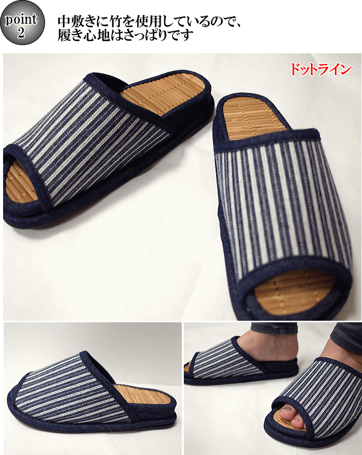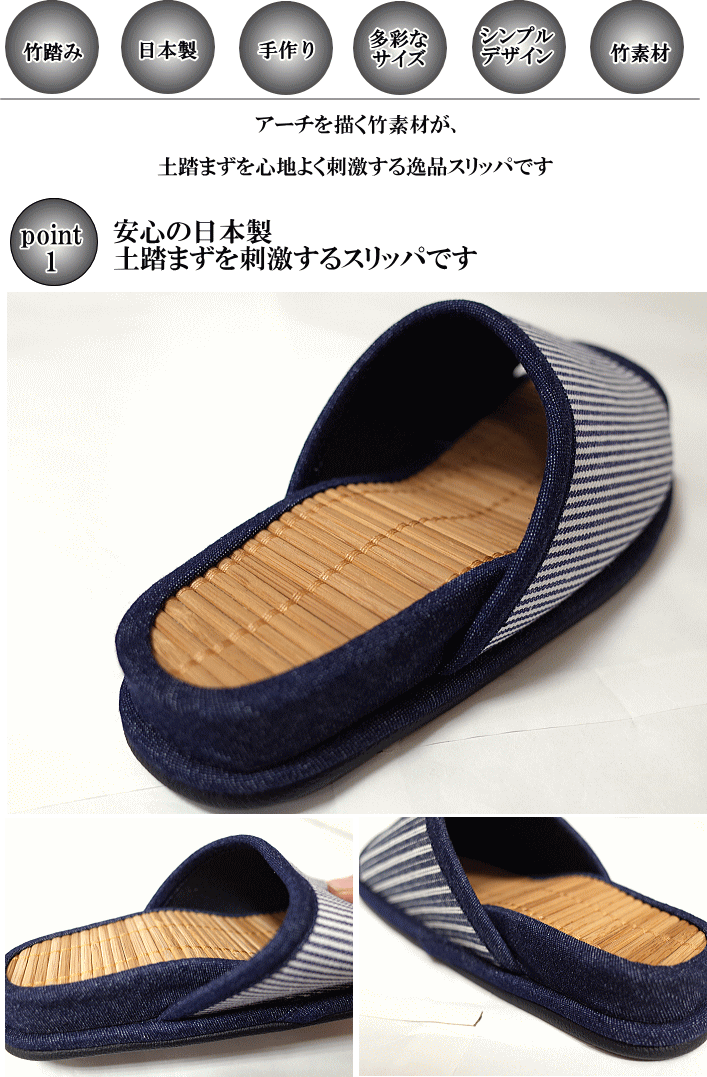 商品名 クレオ D型セノーテデニムストライプ デザインコンセプト アーチを描く竹素材が、土踏まずを心地よく刺激する逸品スリッパです 展開サイズ Mサイズ 約24cmまで Lサイズ約27.5cmまで 素材 底はPVCレザー 使用上の注意 滑りやすい所では、スリップにご注意下さい 生産国 日本 ドットラインとスモールラインの2柄あります 機能 履いているだけで気持ちよ〜く土踏まずを刺激してくれる竹踏みスリッパ 製品と画像の御案内 商品の特性上、竹素材の色合が異なる場合があります。
