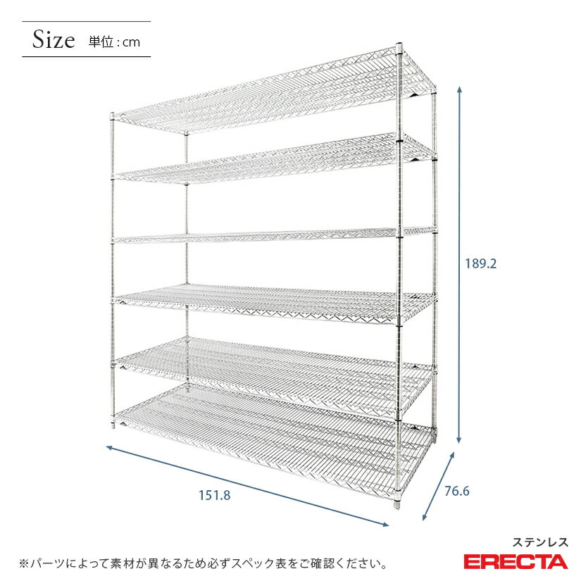 【送料無料】 エレクター ERECTA ステンレスエレクター シルバー ステンレスラック ステンレス製 ステンレス棚 什器 厨房 メタルシェルフ ステンレスシェルフ ワイヤーラック 収納ラック 業務用 オフィス 会社 幅150×奥行75×高さ190 6段 SLMS1520PS1900W6 スチールラック