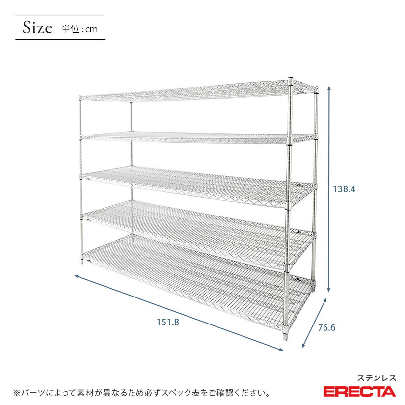【送料無料】 エレクター ERECTA ステンレスエレクター シルバー ステンレスラック ステンレス製 ステンレス棚 厨房 メタルシェルフ ステンレスシェルフ ワイヤーラック 収納ラック 業務用 オフィス 幅150×奥行75×高さ140 5段 SLMS1520PS1390W5 メタル製ラック
