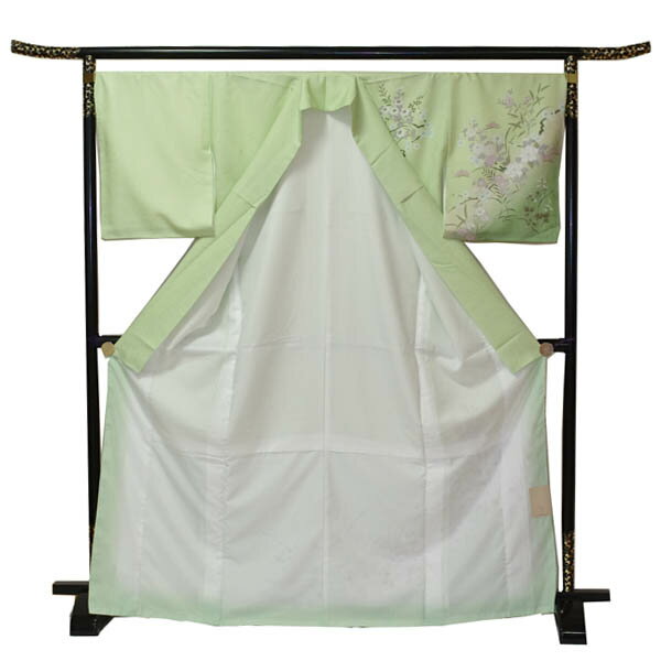 素材 表裏 ポリエステル100% サイズ 身丈163cm・袖丈49cm・裄68cm前幅25cm 後幅30cm 色 黄緑 洗濯表示 洗濯機(○)手洗い(30) アイロン(中温あて布) 特徴 仕立上り袷付下げです。