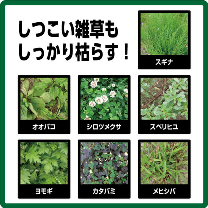 ・作用性の異なる3種類の有効成分を配合した除草剤で、一年生雑草や多年生広葉雑草、スギナなど各種雑草に効果をあらわし、葉や茎だけでなく根まで枯らす・メヒシバ、エノコログサなどしつこいイネ科雑草もしっかり枯らす・雑草種子の発芽を抑える効果もあり、長期間(約6ヵ月)雑草の発生を抑える外観サイズ幅122×奥行76×高さ230