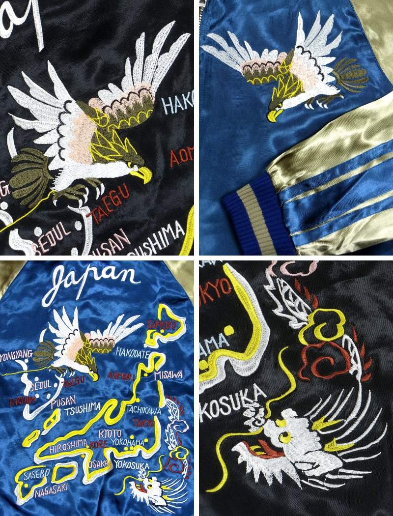 3RSJ-025 鷹と日本地図リバーシブルスカジャン ●商品詳細 ブランド:Japanesque 商品名:鷹と日本地図リバーシブルスカジャン 品番:3RSJ-025 カラー:ブラック、ブルー サイズ:S・M・L・XL・XXL 素材:表 レーヨン100% 裏 ポリエステル100% 前面:刺繍 背面:刺繍 ※商品の色調に関しては細心の注意を払っておりますが、御覧になられる環境によって差異がございます。